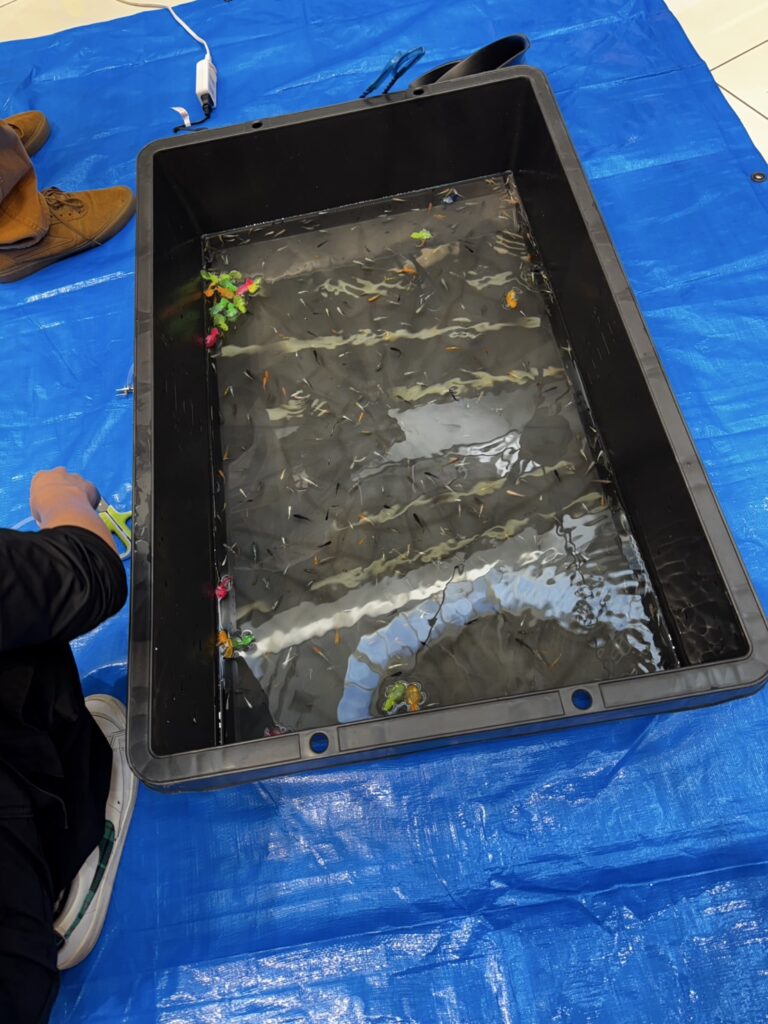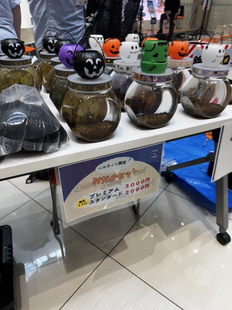 “めだかくじ”や“めだかすくい”、ハロウィングッズの販売を行いました。日曜日だったこともあり、本当に多くのお客様に来ていただきました。20口用意していためだかくじは完売し、めだかすくいはお客様がイベント開始から終了時までほぼ途切れることがありませんでした。子供たちが一生懸命めだかすくいにチャレンジしている様子をみて、やってよかったなと思える時間となりました。めだかすくいでなんと45匹をすくったお客様もいました。Σ(・□・;)