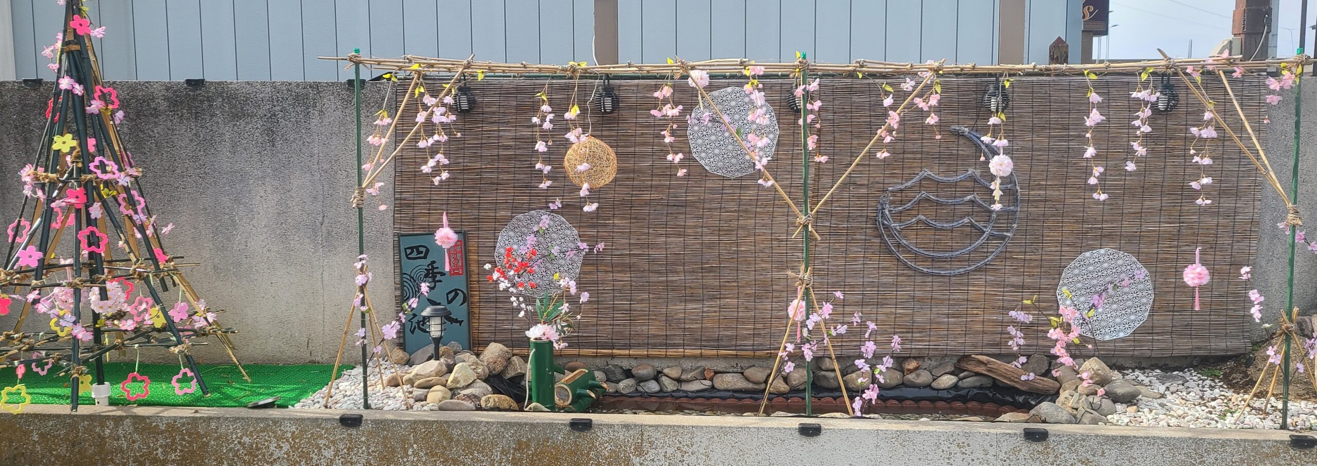 いままではイルミネーションがメインの夜にきれいさ際立つ池となっていましたが、桜の装飾を取り付けたことでかわいい春を感じさせる池に変身しました‼